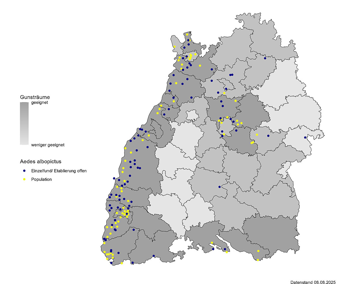 Einige Regionen in Baden-Württemberg sind besonders geeignet für die Einschleppung und die Etablierung der Tigermücke, auch durch die Nähe zu Ländern mit starker Verbreitung von Tigermücken wie Frankreich und Italien. So können die Mücken als ‚blinde Passagiere‘ z.T. mit dem PKW nach Deutschland gelangen. Auch Importe über den Güterverkehr sind möglich. Hierdurch kann sich die Tigermücke in klimatisch geeigneten Regionen in Baden-Württemberg ansiedeln. Mittlerweile wurde die Tigermücke in allen als Gunsträume identifizierten Stadt- und Landkreisen Baden-Württembergs nachgewiesen; meistens in Form von Einzelnachweisen, aber auch als etablierte Populationen, die teilweise schon länger bekämpft werden. Folgende Karte stellt die Verbreitung und die Gunsträume der Tigermücke dar: