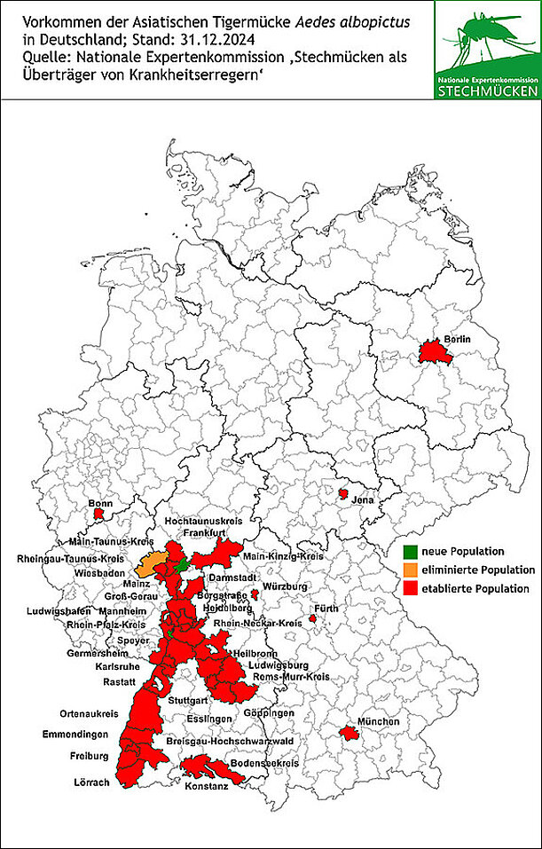 Mittlerweile wurden auch in anderen Bundesländern Tigermücken identifiziert (siehe Abbildung). Aufgrund der klimatischen Bedingungen ist mit einer weiteren Ausbreitung der Mücke in Deutschland zu rechnen.