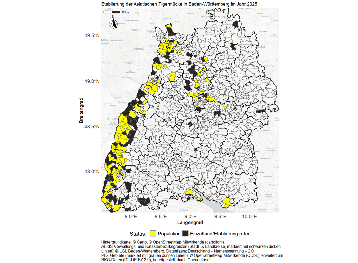 Verbreitung der Asiatischen Tigermücke in Baden-Württemberg in 2025 (Stand 01.12.2025).